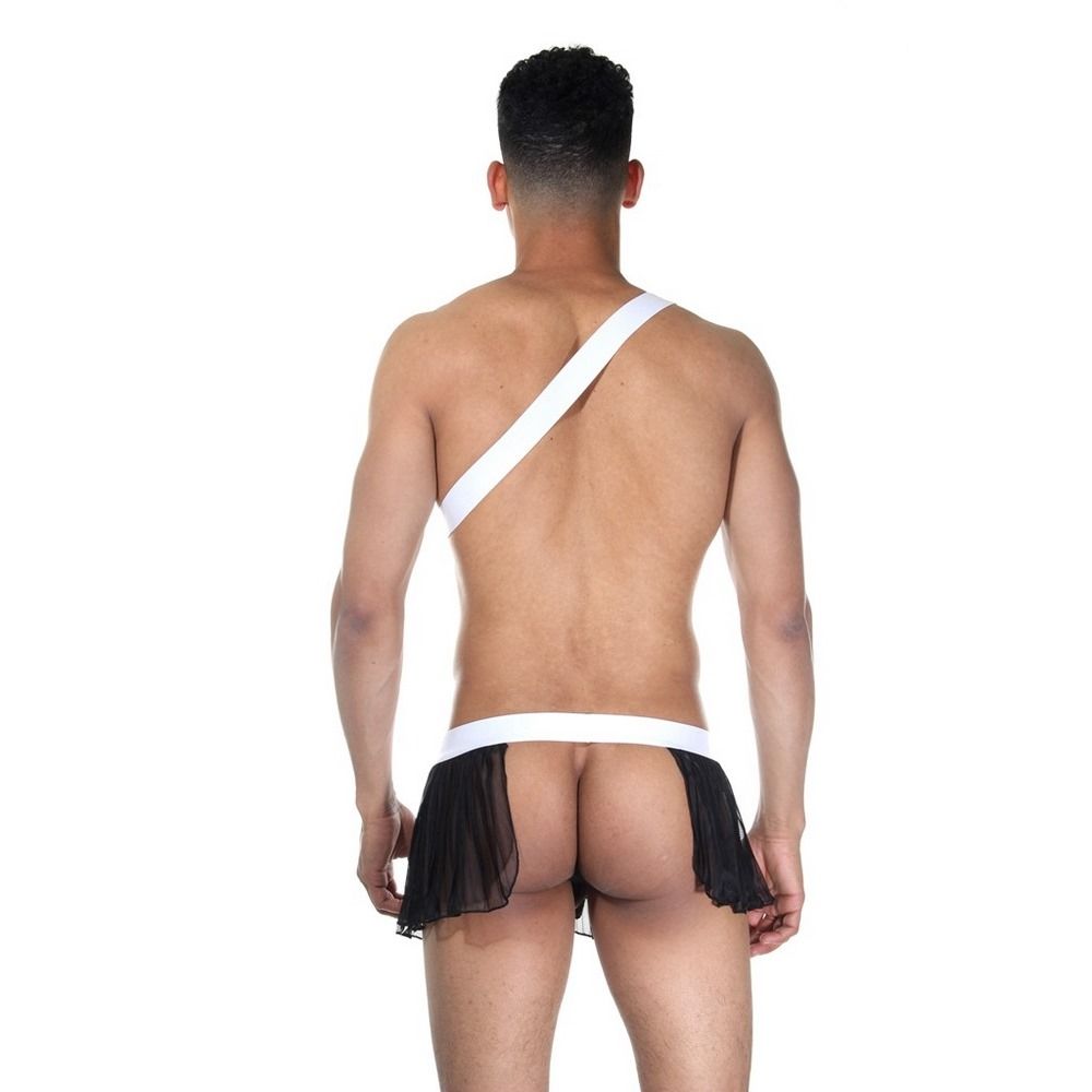 Эротичный костюм для мужчин, состоящий из черной плиссированной юбки на белом поясе с открытыми ягодицами и черно-белой повязки, которая одевается на верхнюю часть тела. В комплекте: юбка, наплечник.