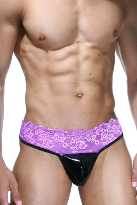 Трусы-танга двухцветные, в которых скомбинированы кружевной ярко-фиолетовый пояс и кружевная задняя часть трусов с лаковым гладким блестящим черным материалом в районе мошонки.