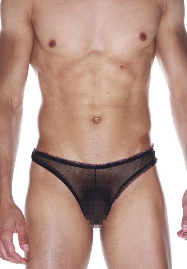 Бразилиана для мужчин из полупрозрачной черной ткани. Окантованы узкой маленькой рюшей, которая оторочена розовым цветом.