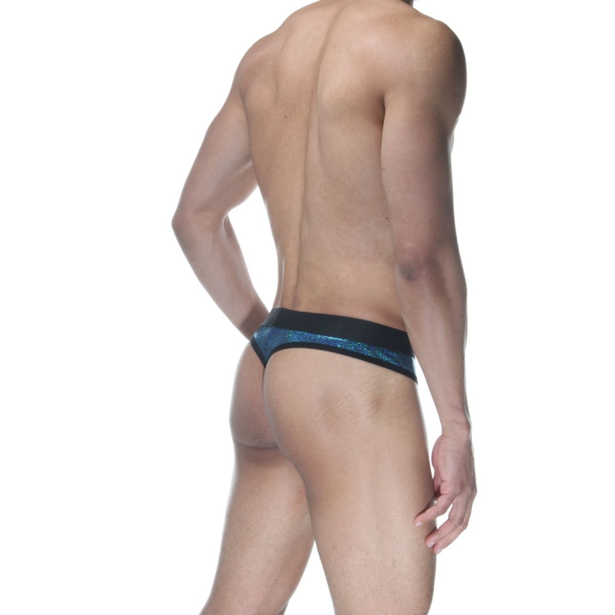 Синие блестящие мужские трусы-стринги.