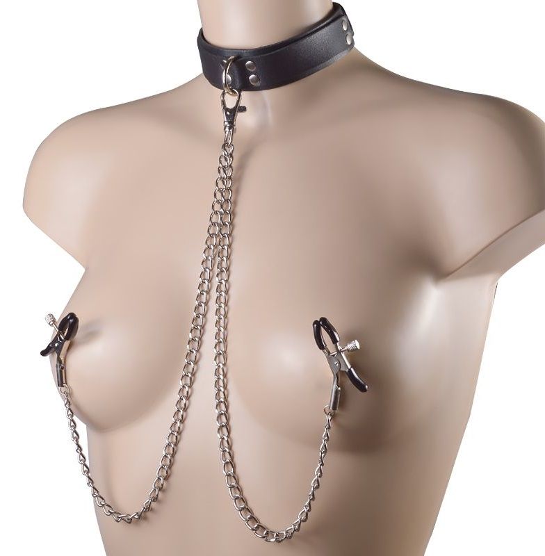 Ошейник с зажимами на соски изготовлен из натуральной кожи с применением никелированной фурнитуры, декорирован клепками. Регулируется ошейник при помощи пряжки, что позволяет оптимально подобрать размер. Зажимы оснащены пружинным механизмом, за счет чего легко и удобно фиксируются на месте, винтики позволяют отрегулировать степень давления в соответствии с индивидуальными предпочтениями. Поводок кожаный. Ширина ошейника - 3 см. Длина металлической цепочки - 40 см.